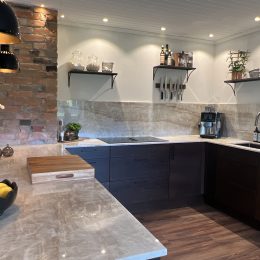 I detta Formakök skapar greigefärgade luckor en varm, inramad design. Stenskivorna ger hållbarhet, perfekt för dig som älskar moderna lantkök med jordnära toner och tidlös kvalitet.