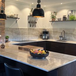 I detta Formakök skapar grafitgrå luckor och marmorbänkskivor en dramatisk, modern look. Designen är perfekt för dig som söker ett exklusivt kök med tidlös skönhet och robusta material i hemmets centrum.